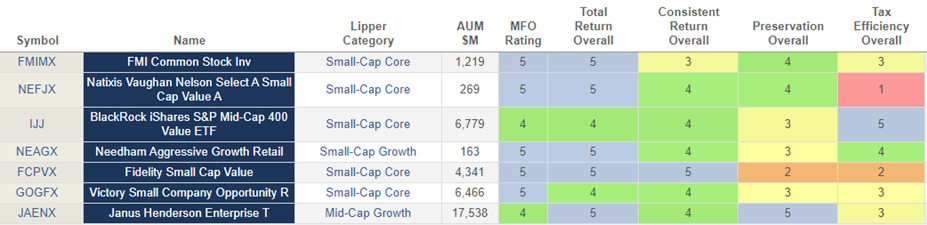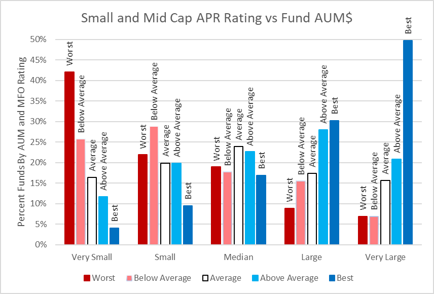 Finally, I looked at small- and mid-cap funds to see if larger funds outperform. I extracted over three hundred actively managed funds in the small- and mid-cap core and growth categories and segregated them by AUM per Lipper Category. Indeed, larger funds in the Lipper Categories outperform as measured by MFO Rating (risk-adjusted return) and APR Rating (Annualized Return).