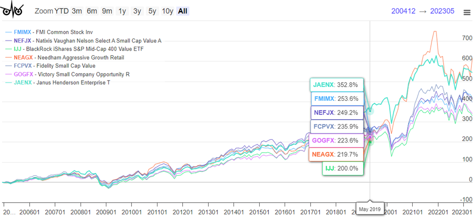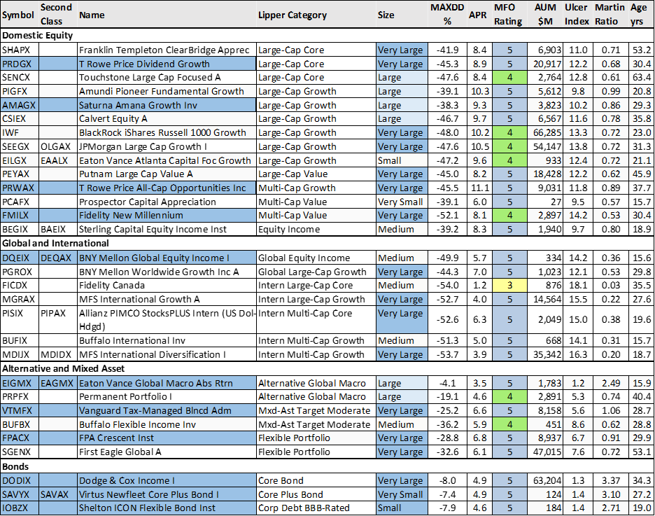 Will fund performance drop off if the fund gets too large or management changes? I extracted all of the MFO Great Owl Funds for this time period to exclude those whose performance declined recently. I excluded funds that are not available at either Fidelity or Vanguard or have high minimum initial investments. “Second Class” refers to funds with a different share class that are available but the expenses are higher. I also filtered the list to exclude funds with low “Family” ratings and those whose performance have declined recently. Most of the Great Owls are larger funds, however, there are several smaller Great Owls available to individual investors. I reviewed the charts of the funds and narrowed the list to those that I favor. These are designated with the names shaded blue.