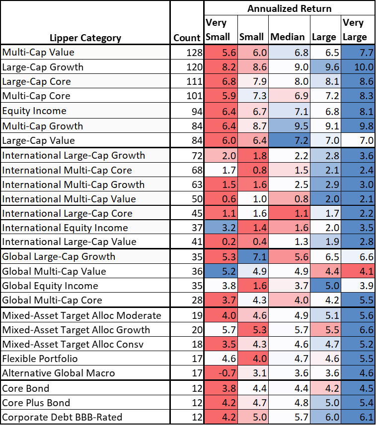 Table #1 breaks Annualized Return down by Lipper Category and AUM. In general, the largest fund quintile within a Lipper Category has a one to three percent APR advantage over the smallest of funds within the same category.