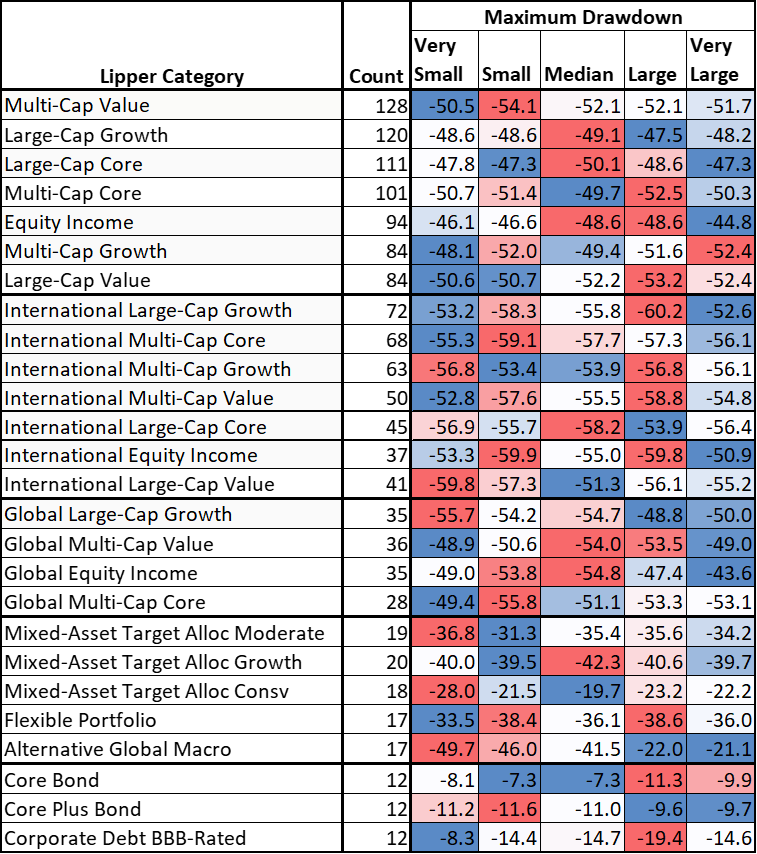 The table for Maximum Drawdown is less clear. Smaller funds often have better downside protection.