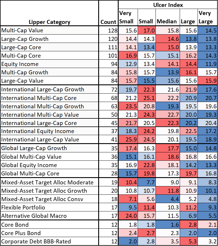 The Ulcer Index which includes the length of drawdown in addition to the depth does show a lower Ulcer Index for larger funds. Larger funds may recover faster from drawdowns than smaller funds.