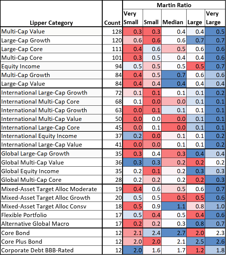 With higher returns and lower Ulcer Index, it makes sense that the Martin Ratio (Risk Adjusted Return) is higher for larger actively managed funds.