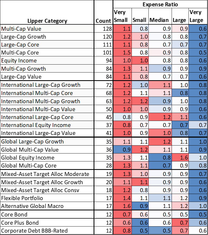 Smaller funds that perform well may not grow into larger funds because of limited access to brokers, or being an institutional share class that is not available to retail investors. Some managers temporarily “close” funds to enhance long-term performance. Larger funds may have advantages such as economies of scale, larger pools of management talent, and research resources. Table #5 shows that expense ratios of the largest funds are about a half percentage point lower than the smallest funds which accounts for some of their outperformance.