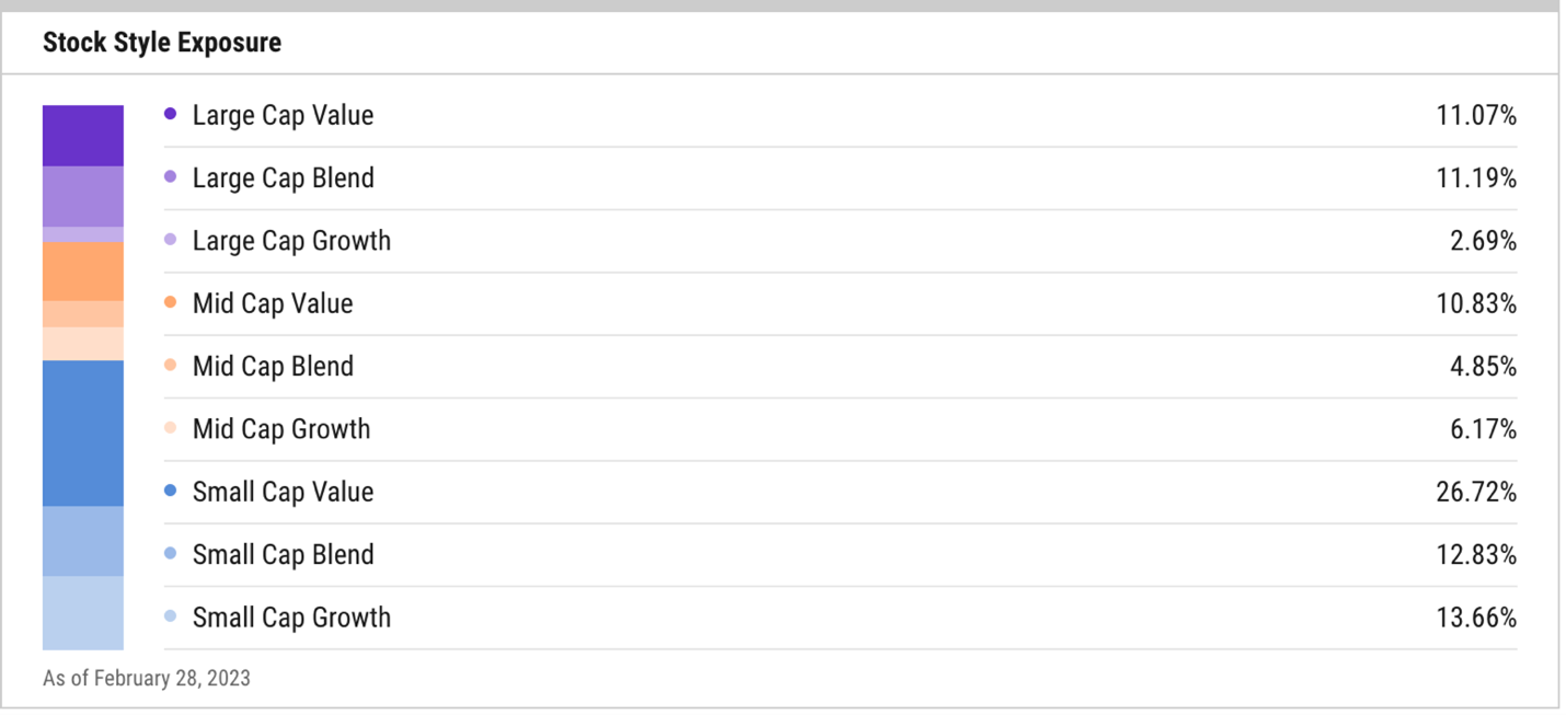 Next, compare its position in exposure, where only a quarter of the portfolio is in growth stocks. And these are not the same kind of growth stocks one would find in a technology fund.