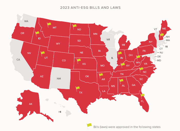 To be clear: red in this map is not “Republican.” It is “at least one anti-ESG bill introduced.” The yellow flags signal the instances in which at least one bill became law. (Source: Pleiades 2023 Statehouse Report).