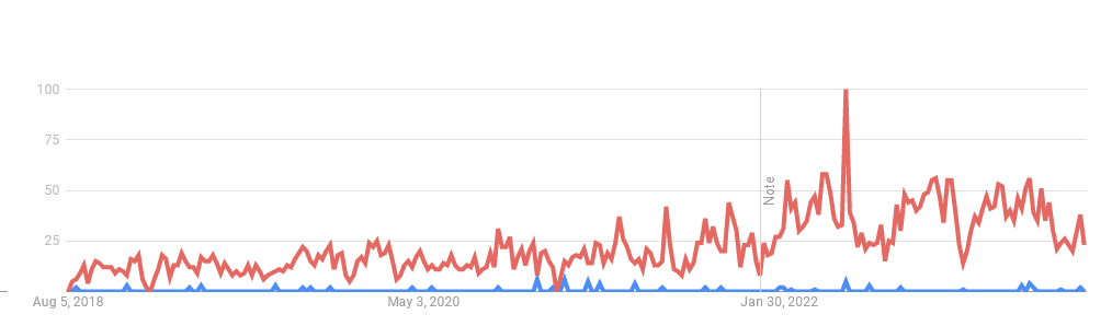Perhaps fittingly, greenhushing (the blue line) receives far less attention than greenwashing (the red line):