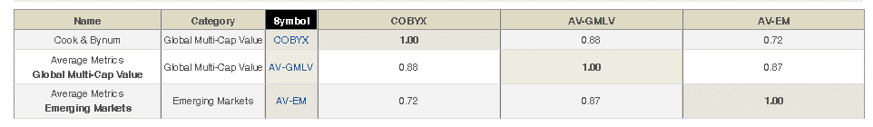 The curious finding is not that COBYX correlates more with multi-cap value than with emerging markets (0.88 versus 0.72); it is that COBYX has a nearly identical correlation with multi-cap value as does the average emerging markets fund (0.88 versus 0.87).