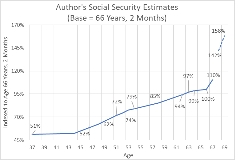 Needless to say, things often don’t go according to plan. You may not be able to work as long as you would like to complete your financial plans. There are financial speed bumps along the way. Ultimately, I worked until age 67, which is beyond the normal retirement age for both my employer pension plan and social security. Working longer means that you are still adding to savings instead of drawing from them. The impact on Social Security benefits is described later.