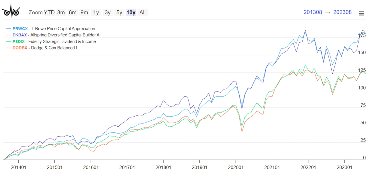 T Rowe Price Capital Appreciation (PRWCX) is the standout performer. It is the category’s only Great Owl, which means it is the only growth allocation fund to generate consistently top-tier risk-adjusted returns over all trailing periods. To be clear, it is The One out of 250 such funds. It has been in existence for 37 years and has been managed by David R. Giroux for the past eighteen years. As a result of its performance, it has grown to $53 billion in assets under management. For the past ten years, Allspring Diversified Capital Builder (EKBAX) has had similar high overall performance but with more risk. I like that PRWCX has a stock allocation of 62%, which is moderate compared to EKBAX, with 84%.