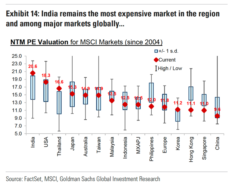 Devesh: I know he’s liked India in the past and is bullish about the Lollapalooza effect. Everything is coming together for Mother India to have sustainable growth for decades ahead. One of my friends who runs another Indian hedge fund, Nischay Goel of Duro Capital out of Singapore, calls the investment opportunity in India over the next ten years Ridonculous!! The success of the South Pole moon landing, the G20, the dominance of Narendra Modi’s political party, and the common man finally being full of pride and seeing the benefits accrue from progress is a sight to behold. Infrastructure is improving throughout the country, and there’s going to be a truckload of billionaires being minted in India over the next ten years. $39 billion dollars of domestic money flows into stocks each year as domestic wealth generation and liquidity events unbound, and most investors cannot take their money abroad. The flip side: Indian stocks are expensive, at the highest valuation in Emerging Markets.