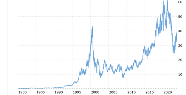 Hmmm … well, if you had bought this early Magnificent Seven stock at its $41/share peak in 2000, you would have been subject to some short-term repricing (say an 80% loss in the following two years), but you would have roared back to your $41 purchase price … 18 years later. Followed by a surge and another downward adjustment so that the current share price remains about 25% below its 2000 level.