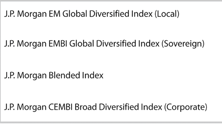 Passive ETFs generally follow Benchmarks. In EM Debt, there are four benchmarks: