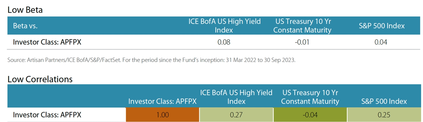 The Global Unconstrained fund has a low beta and low correlation to US assets like the HY Index, the 10-year Treasury, and the S&P 500 Index.