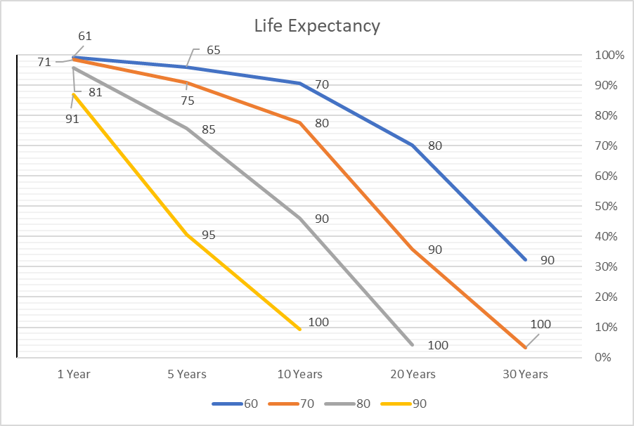 The life expectancy for women at birth is about 79 years. Figure #3 shows how life expectancy changes with age. There is roughly a 32% chance that a 60 year-old-woman will live to age 90. A woman who has lived to age 80 has roughly 45% of living to age 90. We should prepare for maximum life expectancy rather than average life expectancy in order to not outlive our savings.