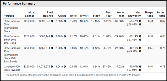 The results for the thirty-seven-year period are that investing 100% in the S&P 500 had the highest return, but also a maximum drawdown of 68% including a 6% withdrawal rate. The second-best performing strategy is the 70% US Stock (VFINX) and 30% Bonds (VBMFX) portfolio which also had the highest Sortino Ratio or risk-adjusted return. The portfolios are rebalanced annually.