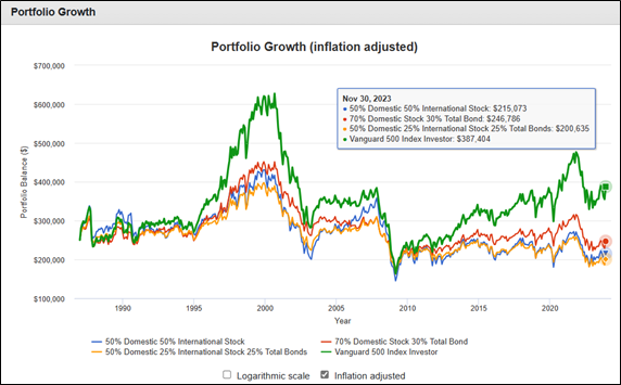 Portfolio Visualizer can be used to find the best-performing strategies from 1985 to 2023. I created three strategies for comparison with the S&P 500. The link to the Portfolio Visualizer Backtest is here. The strategies are 1) 100% US stock (VFINX), 2) 50% US stock (VFINX) and 50% International Stock (VTRIX), 2) 70% US Stock (VFINX) and 30% Bonds (VBMFX), and 3) 50% US stock (VFINX), 25% International Stock (VTRIX), and 25% Bonds (VBMFX). I assumed a 6% annual withdrawal rate.