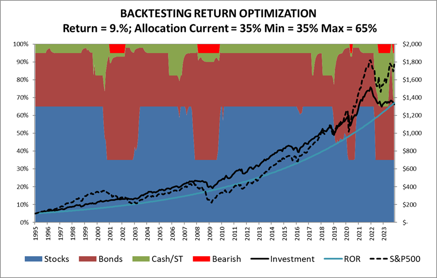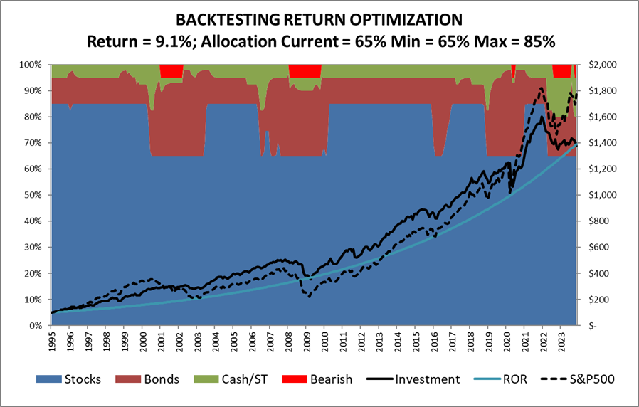 I built my Investment Model shown in Figure #5 to optimize returns by varying allocations to reflect economic, financial, and market conditions. The model is intended to adjust slowly to market conditions and not to be used for frequent market timing. It works most efficiently with tax advantaged accounts. Minimum and Maximum allocations to stock are variables. Using a minimum allocation to stock of 35% and a maximum of 65% results in an average annual return of 9.0% with an average allocation to stock of 58%. It beat the S&P 500 until 2020 when massive stimulus inflated asset values.