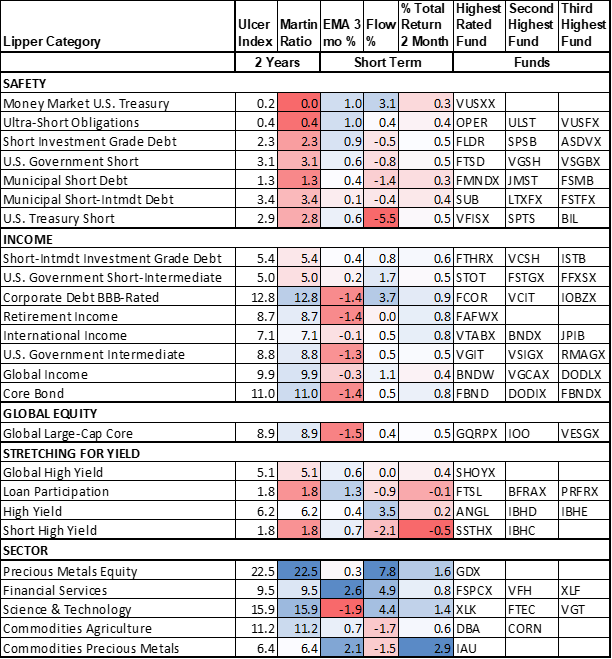 Table #5 contains the top-performing Lipper Categories for the 635 funds that I currently track. I built a rating system based on momentum and money flow to measure what Lipper Categories and funds are trending with investor support. The first group of funds is short-term, quality fixed income. The Ulcer Index measures the depth and duration of drawdowns over the past two years, while the Martin Ratio measures the risk-adjusted performance over the past two years. The second group is the one that interests me the most and consists mostly of fixed-income funds with intermediate durations. Notice that Global and International funds are included.