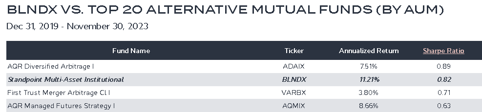 Finally, Standpoint itself publishes two comparisons which are updated monthly. The first is a comparison of the 20 largest alternatives funds by asset. Since inception (through 11/30/2023), Standpoint beat all of them in total return and all but one in risk-adjusted returns, as measured by the Sharpe ratio.