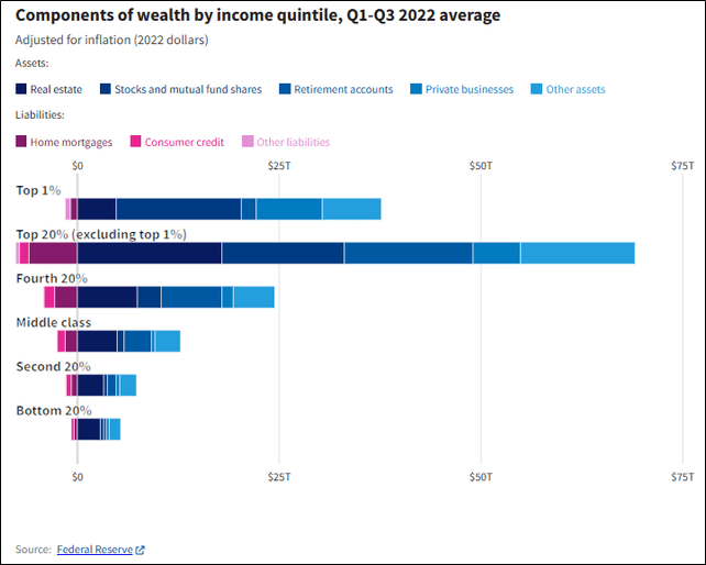 USA Facts produced this fascinating chart of income versus wealth below. The wealth of the Bottom 60% by income group is mostly held in real estate (home), other assets (i.e. vehicles, appliances, etc.), and retirement accounts while the wealthiest income groups increasingly own stocks and mutual fund shares and private businesses.