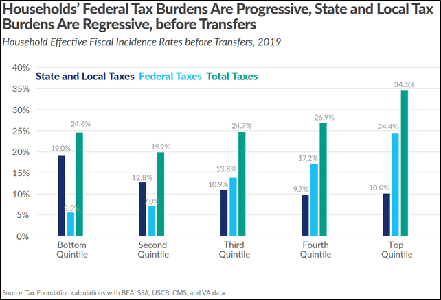 The following chart from the Tax Foundation estimates average Federal and state/local tax burdens in 2019 by household income levels. State taxes tend to be regressive having a greater impact on lower income groups. Average total Federal, State, and Local income tax burdens are 24.6% for the bottom income group and 34.5% for the Top income group.