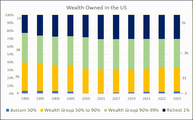 I created the following chart from the Board of Governors of the Federal Reserve System Distributional Financial Accounts to show how the distribution of wealth has changed over time. The share of the wealth of the wealthiest 1% grew from 23% to 31% during the past three decades while the share of the wealth of the 50% to 99% groups has fallen from 73.6% to 66.9%.