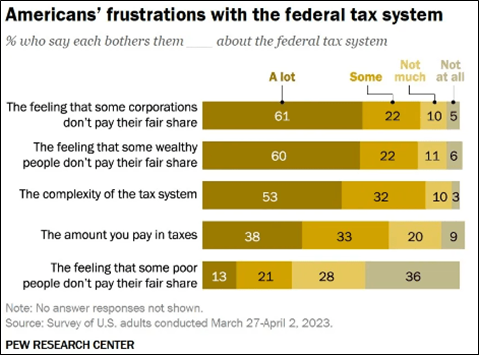 The Pew Research Center found that over 60% of respondents to a survey believe that corporations and the wealthy aren’t paying their fair share of taxes. Very few think the poor aren’t paying their share of taxes. Democrats and Democratic Leaners strongly feel (77%) that corporations and wealthy people do not pay their fair share. By contrast, 43% or more Republicans and Republican Leaners feel that the wealthy and corporations are not paying their fair share of taxes. This is consistent with surveys by GALLUP and Reuters/Ipsos.