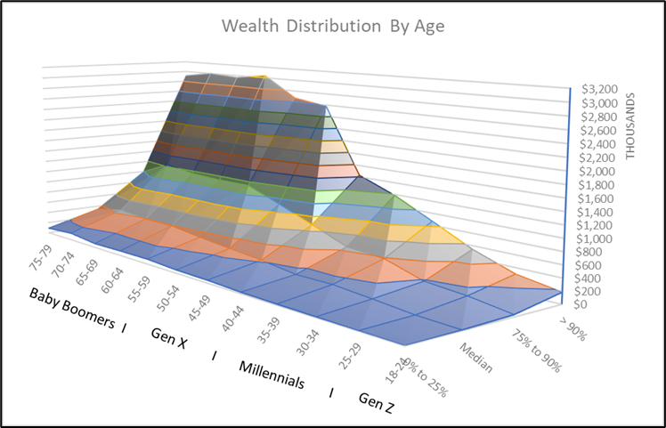 I created the next chart from data provided by the Federal Reserve Survey of Consumer Finances to show the wealth distribution by age. The Baby Boomers and older Gen X are the wealthiest Americans (Top 90%).
