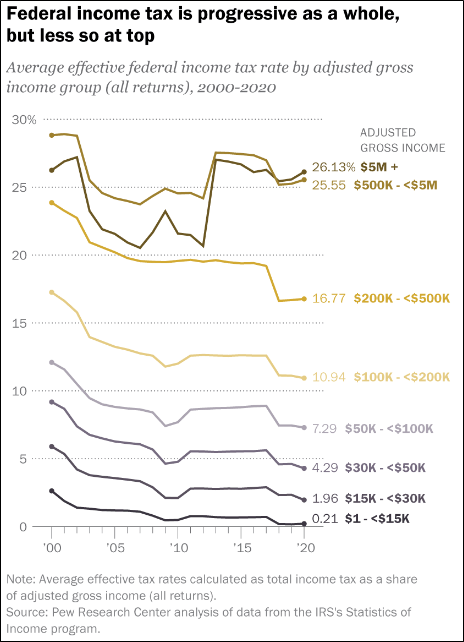 The Pew Research Center analyzed data from the IRS’s Statistics of Income Program to produce the following chart. It shows that most income groups had a reduction in the average effective federal income tax rate during the past two decades.