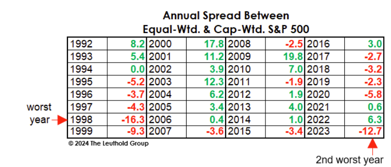 The market-cap-weighted S&P 500 hit a record high in late January 2024. The equal-weighted S&P 500 strategy suffered an epic setback relative to the S&P 500 in 2023.