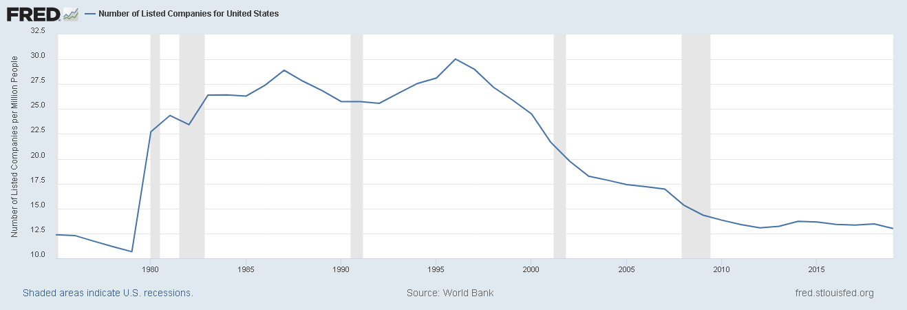 The number of corporations per million of population was between 25-30 in the 1990s and is closer to 13 as of 2019 (inexplicably, that’s the most recent St. Louis Fed report and also the most recent for several other data sources. Statistica estimates that the number of NYSE stocks has fallen by about 500 since then, while the number of NASDAQ-listed ones remains roughly the same.