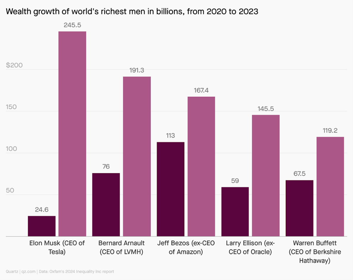 The world’s richest men—Elon Musk, Bernard Arnault, Jeff Bezos, Larry Ellison, and Warren Buffett—have doubled their collective wealth to $870 billion since 2020. That’s a rate of $14 million an hour, with little sign of abatement, according to a new study from the UK-founded charity organization Oxfam.