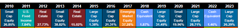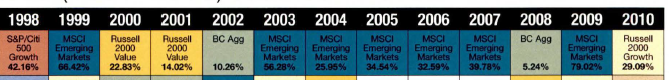 And the best asset classes in the years since. (Callan has done some relabeling, so index names in the old chart are replaced by asset class names in the new one.)