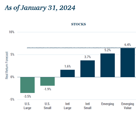 The projections, they aver, are “based upon the reasonable beliefs of GMO” and include a projected inflation rate of 2.3%. That means that the “real” returns projected above are projected asset class returns minus 2.3%.