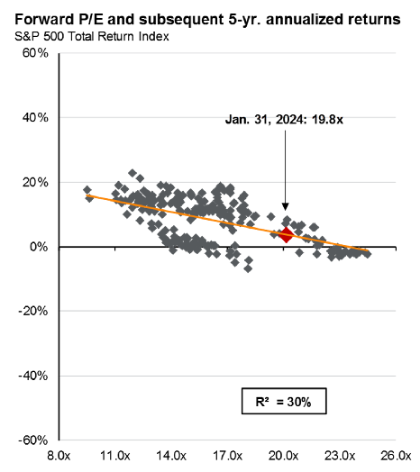 J.P. Morgan is only slightly more optimistic about the next five years. They’ve plotted the five-year returns of the S&P based on how high valuations were at the start of the period.