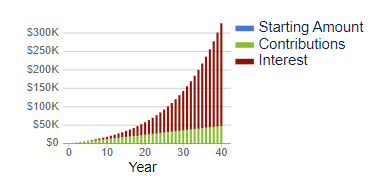 Start now, and it takes $100/month to hit $326,000 in 40 years. Starting in 10 years, it will take $220 a month for the next 30 years. Start now, and $48,000 in lifetime contributions will get you $326,000 in real returns. Wait a decade, and it will take $84,000 to get you there.