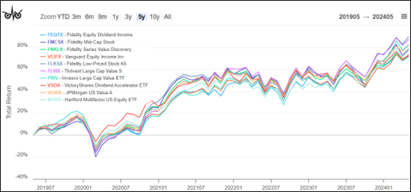 I extracted the mutual and exchange-traded funds with below-average valuations, moderate volatility, and high returns as shown in Figure #2.