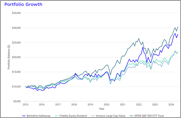 I then compared two of the best ETFs to the Berkshire Hathaway stock for the past ten years. Over the past ten years, Berkshire Hathaway has had returns close to the S&P 500 and above the value funds.