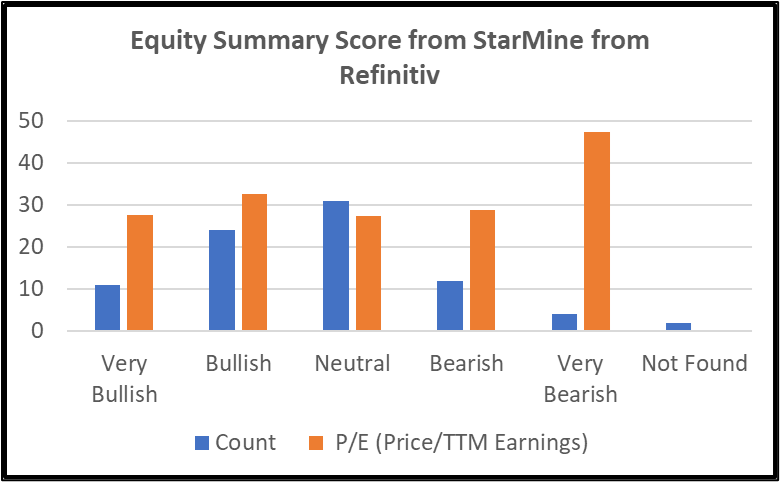 Figure #4 shows the Equity Score from StarMine from Refinitiv for the 84 stocks in the Top Ten Holdings of the outperforming funds. It appears that momentum is driving valuations even higher. My preference is to look for a subset with low valuations.