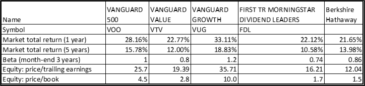 Growth funds have risen faster during the good times such as now, and have fallen harder during the bad times. Figure #1 shows the five-year performance of the S&P 500 (blue line), Vanguard Growth (green line) and Value Fund (orange line) and Berkshire Hathaway (BRK.B, red and green bars), along with the First Trust Morningstar Dividend Leaders Index Fund (FDL, red line). My preference is to start locking in the gains by tilting away from growth toward value. Berkshire Hathaway has fared better than the value funds over the past five years.