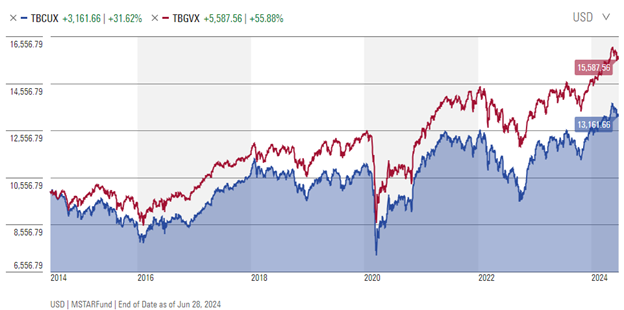 Tweedy, Browne runs one international value portfolio, but it makes it available in two packages. International Value (ticker TBGVX, in red below) hedges its currency exposure. International Value II (TBCUX, in blue) does not. Over ten years, the same $10,000 investment in the same strategy with the same managers would have grown by either $3,161 or $5,587.