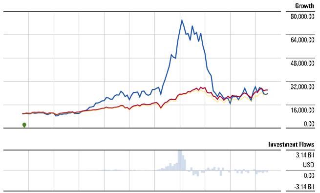 Briefly brilliant performance isn’t all the tough. It requires rather more luck the skill and it can be wildly profitable for the adviser, though deadly for the investors. ARK Innovation ETF is, of course, the current poster child for boom-then-bust. The fund posted triple-digit returns in 2020, saw its assets explode then promptly (and predictably) crashed. Anyone who bought five years ago and has devoutly held on has lost 1% annually and has trailed 99.9% of all similar investors. Those who bought at the peak three years ago have clocked annual losses of 30.3%.