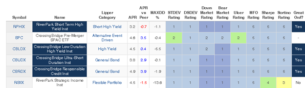 MFO Premium allows us to track funds, including ETFs, on an unusual array of measures of risk awareness, consistency, and risk-adjusted performance. For the sake of those not willing to obsess over whether an Ulcer Index of 1.3 is good, we almost present color-coded rankings. Blue, in various shades, is always the top tier, followed by green, yellow, orange, and red. Below are all of the risk and risk-return rankings for all of the funds advised or sub-advised by Cohanzick/CrossingBridge since inception.