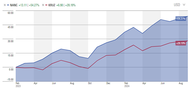 Shareholders of Unusual Whales Subversive Democratic Trading ETF and the Unusual Whales Subversive Republican Trading ETF have been invited to a proxy vote which would allow each fund to lower its expense ratio. That seems nice. The adviser is very clear about the function of the funds: it is to highlight the trading behavior of members of Congress in order to catalyze reform, rather than maximizing shareholder returns. That said, since inception trades by Democratic members of Congress have vastly outperformed those by Republican members.