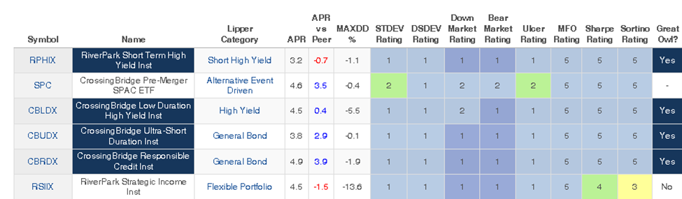 In our Launch Alert for CrossingBridge Nordic Bond, we include a table of the risk-adjusted performance since the inception of all the CrossingBridge Funds. (Short version: top tier across the board.) Each is compared to its Lipper peer average.