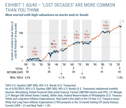 GMO offered an interesting and sobering reminder to the “the market is my friend” crowd. If you were born in 1900 and lived until your 85th year, you would have spent more than half of your entire life experiencing “lost decades” in the financial markets.