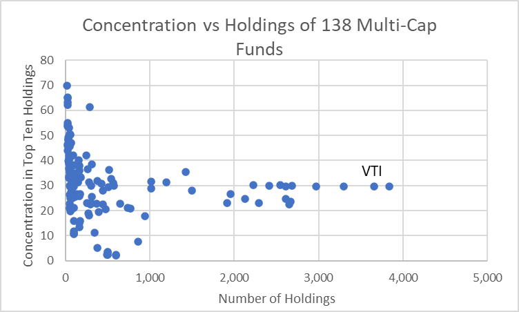 I selected a large sample (138) of Multi-Cap funds excluding those that use a “fund of funds strategy”. The concentration in the top ten holdings is shown versus the number of holdings in Figure #1. There are only a couple dozen funds that follow a true total market approach.