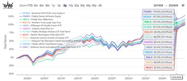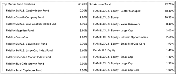 Strategic Advisers Fidelity U.S. Total Stock Fund (FCTDX) is only available to clients enrolled in Fidelity Wealth Services. It outperformed 94% of the multi-cap core funds in this study. Understanding FCTDX is not particularly straightforward. From the Prospectus, I quote a portion of the “Principal Investment Strategy” that summarizes the FTCDX best for me: