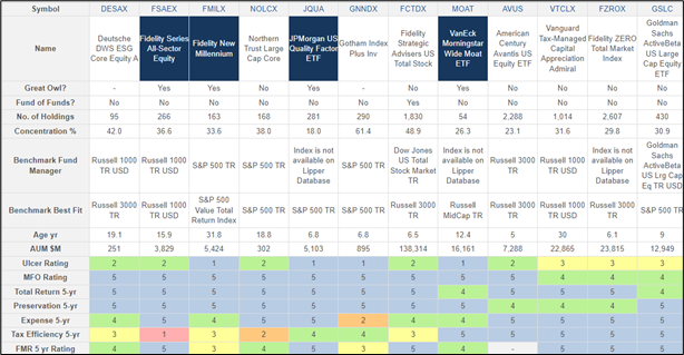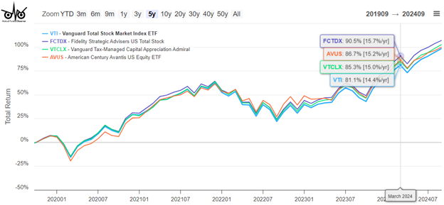 In my professionally managed accounts, Fidelity invests in Fidelity Strategic Advisers US Total Stock (FCTDX) which is only available to clients of Fidelity Wealth Services, and Vanguard invests in Vanguard Total Stock Market Index ETF (VTI) while I invest in Vanguard Tax-Managed Capital Appreciation Admiral (VTCLX) in a self-managed taxable account. I don’t own American Century Avantis US Equity ETF (AVUS) but am interested in the Avantis funds. All four of these funds are top-performing funds.