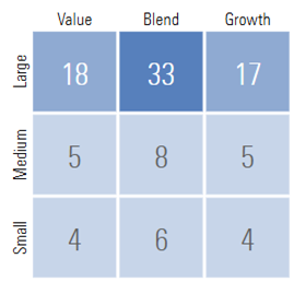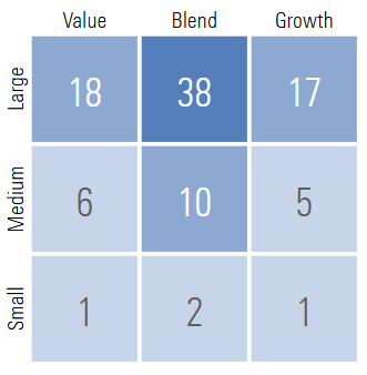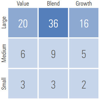 From Morningstar, FCTDX receives four stars and a Gold Analyst Rating. It has a price to earnings ratio of 20.9 compared to 22.3 for VTI, and 22.9 for the S&P 500 (VOO). Stock style weight is shown below: